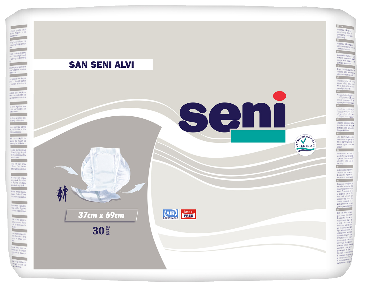 San Seni Alvi to oddychające pieluchy anatomiczne przeznaczone dla osób z nietrzymaniem kału i osób cewnikowanych. Duża powierzchnia i podwyższone osłonki boczne zabezpieczają przed zabrudzeniem. Pieluchy anatomiczne San Seni Alvi nie mają własnego systemu mocowania, dlatego powinny być stosowane wraz z majtkami podtrzymującymi.